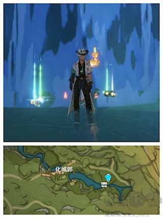 传送到化城郭七天神像,往地图南方一直飞下去瀑布底部,有水史莱姆的镇守宝箱,攻打难度不高。